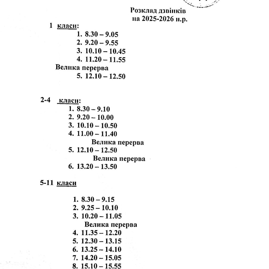 Розклад уроків середньої та старшої школи 2025-2026 н. р.